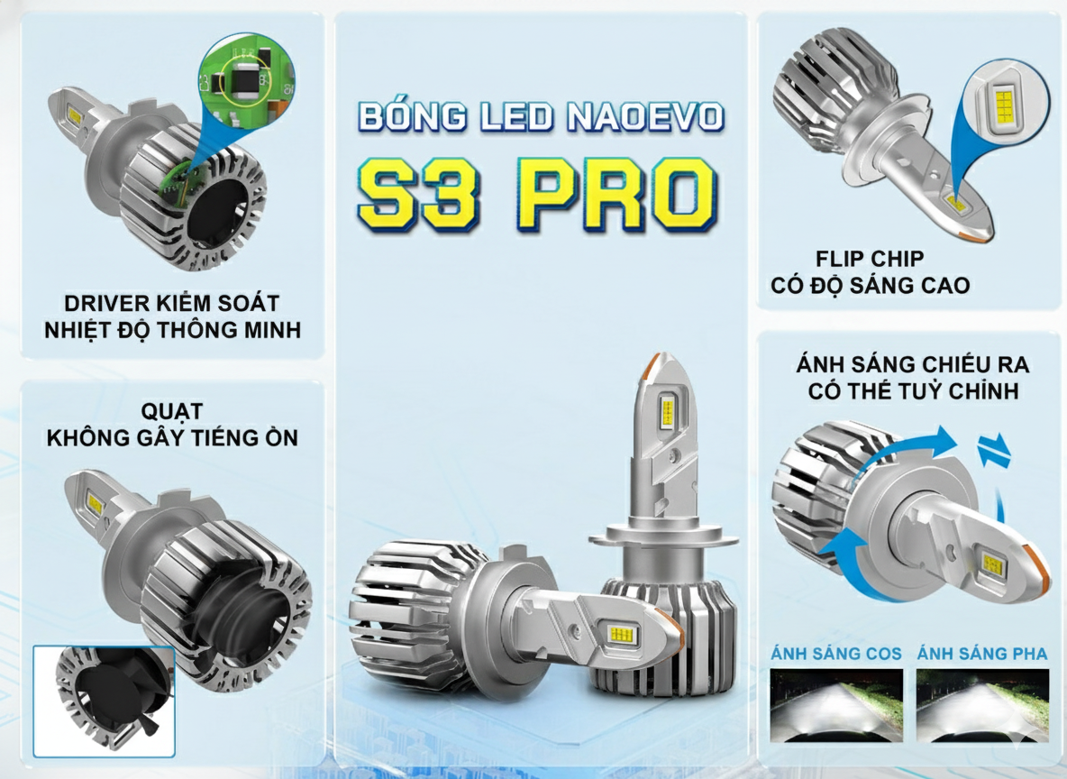 Naoevo S3 Pro là dòng bóng LED tầm trung cao cấp với thiết kế nhỏ gọn, hiệu suất chiếu sáng vượt trội và khả năng tương thích tốt với các dòng xe có hệ thống điện Canbus. Đây là lựa chọn tối ưu cho khách hàng muốn nâng cấp ánh sáng rõ rệt nhưng vẫn tối ưu chi phí.