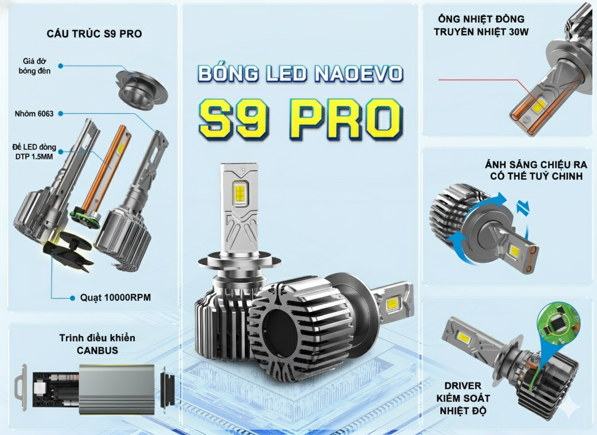 Bóng LED Naoevo S9 Pro là dòng LED cao cấp với hiệu suất chiếu sáng vượt trội, được thiết kế để nâng cấp hệ thống đèn pha hoặc cos của ô tô. Sản phẩm mang lại ánh sáng ổn định, mạnh mẽ, giúp lái xe quan sát tốt hơn trong mọi điều kiện giao thông, đặc biệt khi đi ban đêm hoặc đường thiếu sáng.