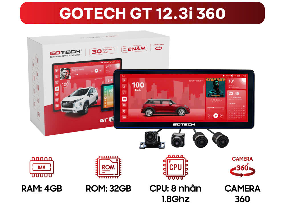 GOTECH GT 12.3i 360 là phiên bản cao cấp kết hợp màn hình Android 12.3 inch lớn và camera 360 độ toàn cảnh, mang lại trải nghiệm lái xe hiện đại, an toàn và tiện nghi. Với màn hình lớn, bạn dễ dàng xem bản đồ, video hoặc theo dõi các điểm mù từ camera 360 một cách rõ ràng và trực quan.