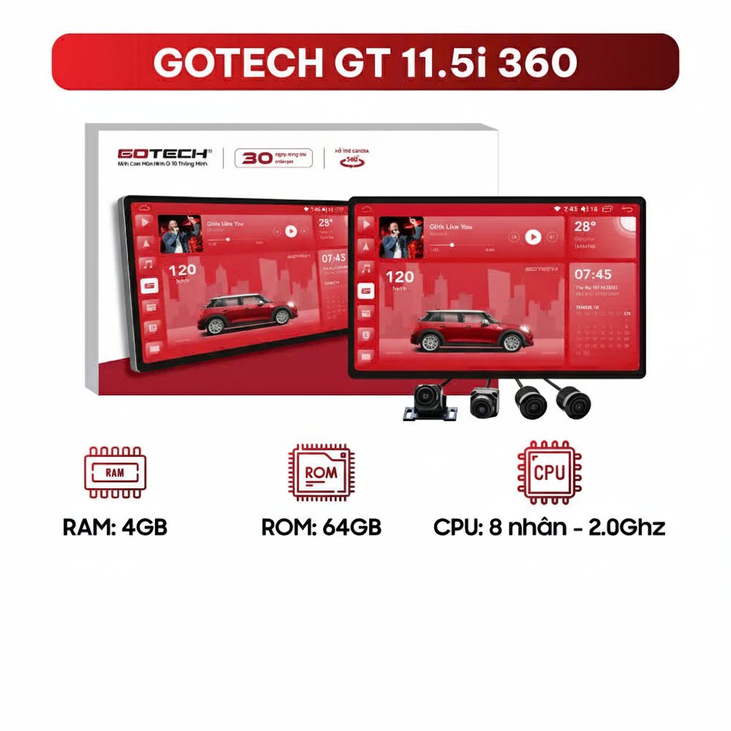 GOTECH GT11.5i 360 là mẫu màn hình Android thế hệ mới dành cho ô tô, sở hữu kích thước lớn 11.5 inch kết hợp hệ thống camera 360 độ toàn cảnh. Sản phẩm không chỉ nâng cấp khả năng giải trí và dẫn đường mà còn tăng tính an toàn khi di chuyển, phù hợp cho nhiều dòng xe sedan, SUV và bán tải.